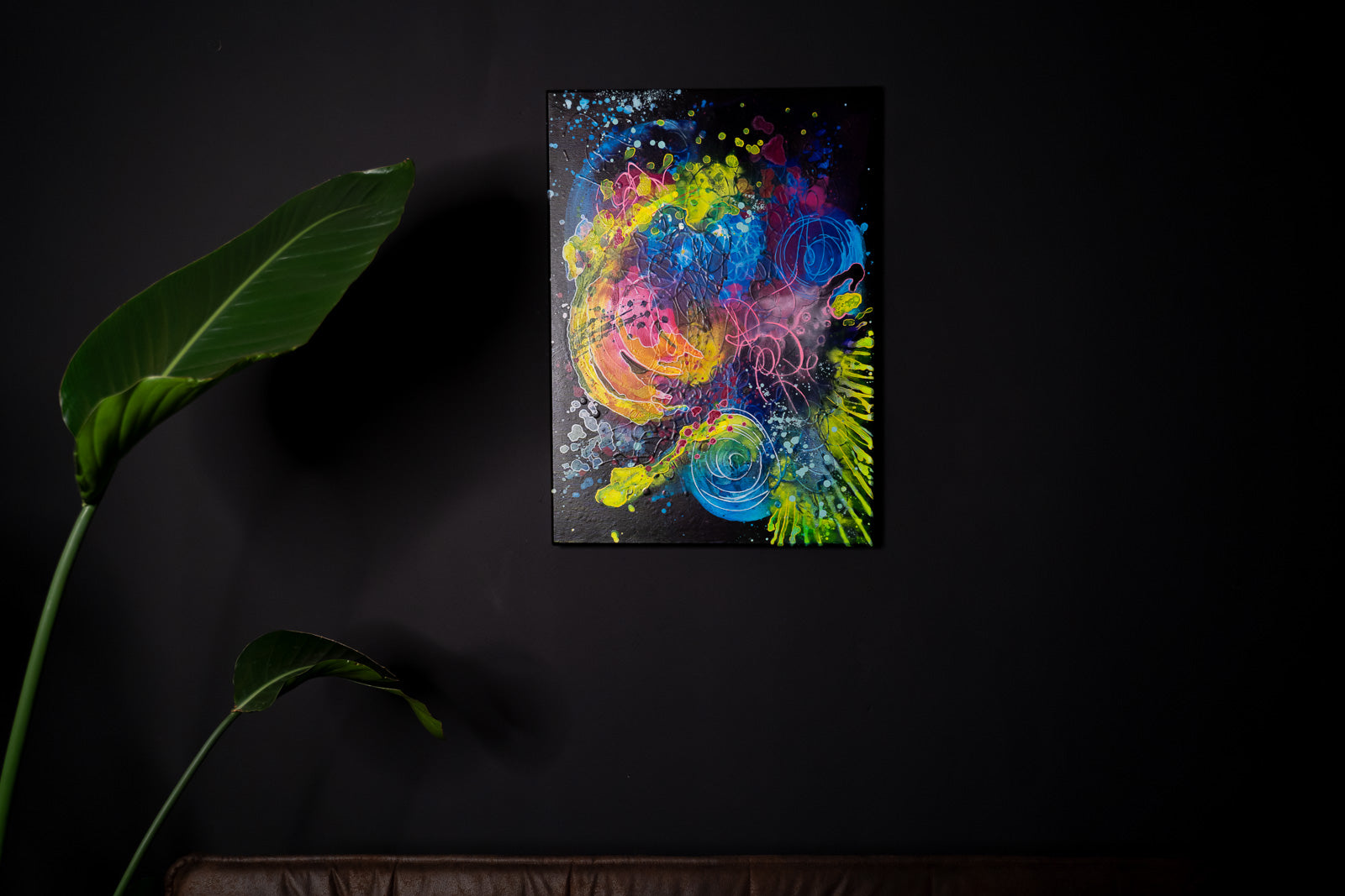 Was dieses Gemälde besonders faszinierend macht, ist die Verwendung von fluoreszierenden Farben, die unter UV-Leuchten zum Leben erwachen. In der Dunkelheit enthüllen sie ein zusätzliches Geheimnis, das nur darauf wartet, entdeckt zu werden.