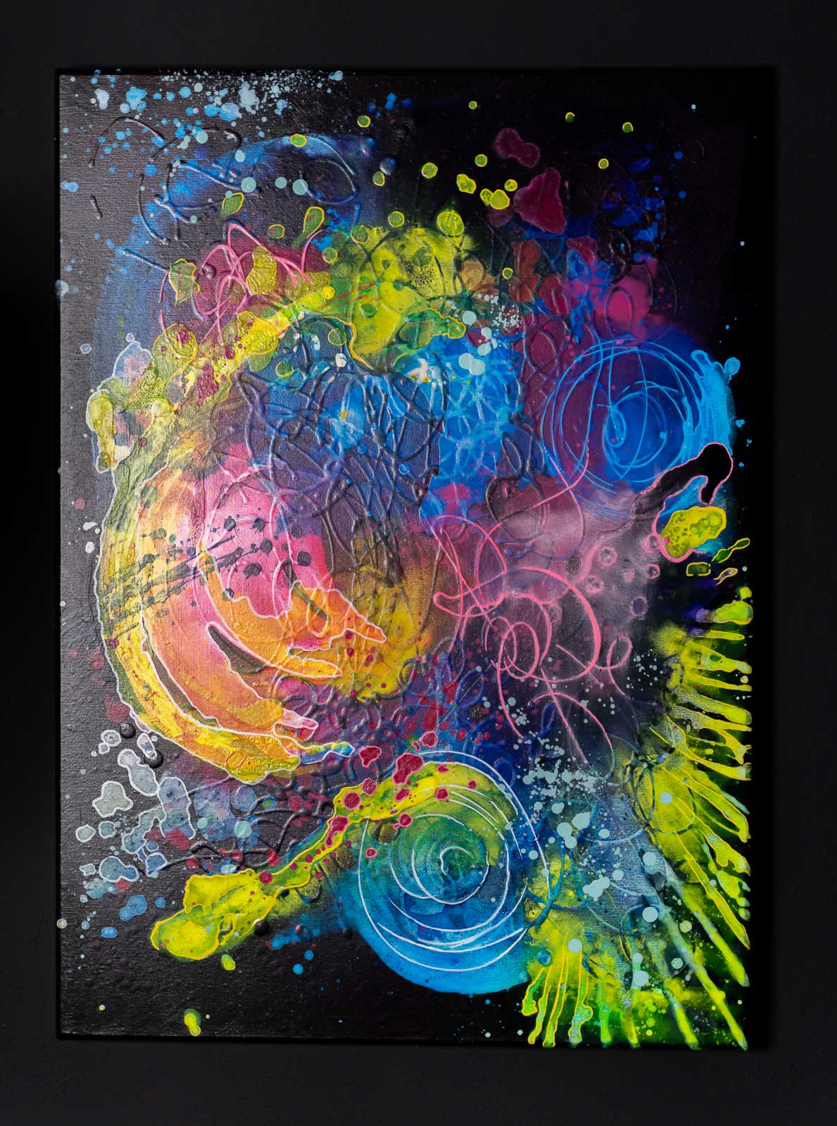 In meinem neuen Kunstwerk, "KOSMOS", lade ich dich ein, auf eine Reise in die unendlichen Tiefen des Universums zu gehen. Dieses abstrakte Gemälde auf Keilrahmen fängt die geheimnisvollen Energien ein, die unser Universum durchdringen. Mit einer lebendigen Kombination aus lila, blau, pink, gelb und schwarz, die fließend ineinander übergehen, habe ich versucht, das unsichtbare Gewebe des Kosmos sichtbar zu machen.